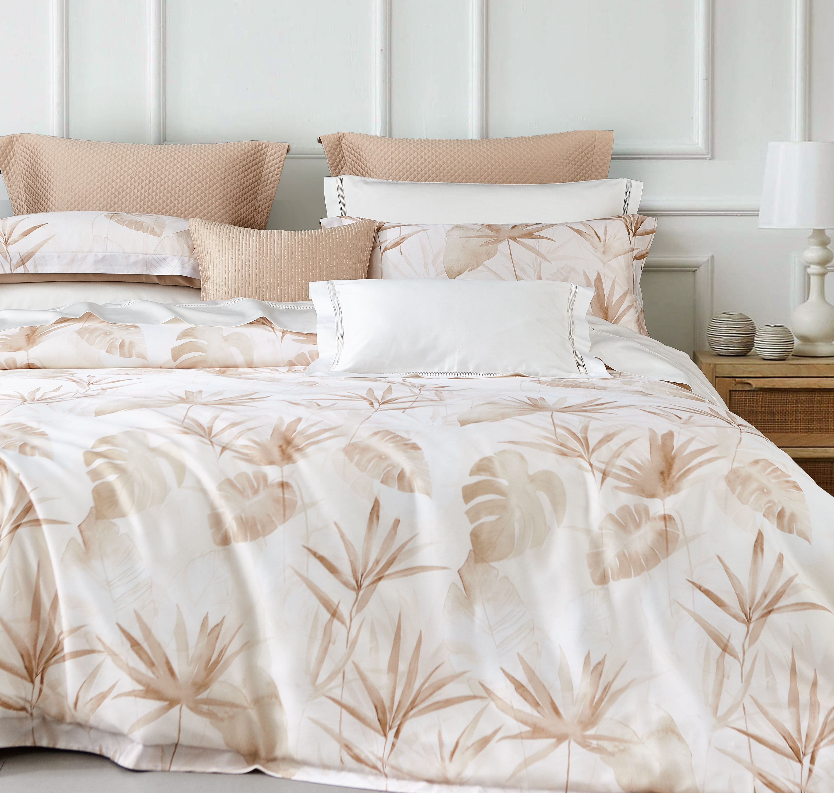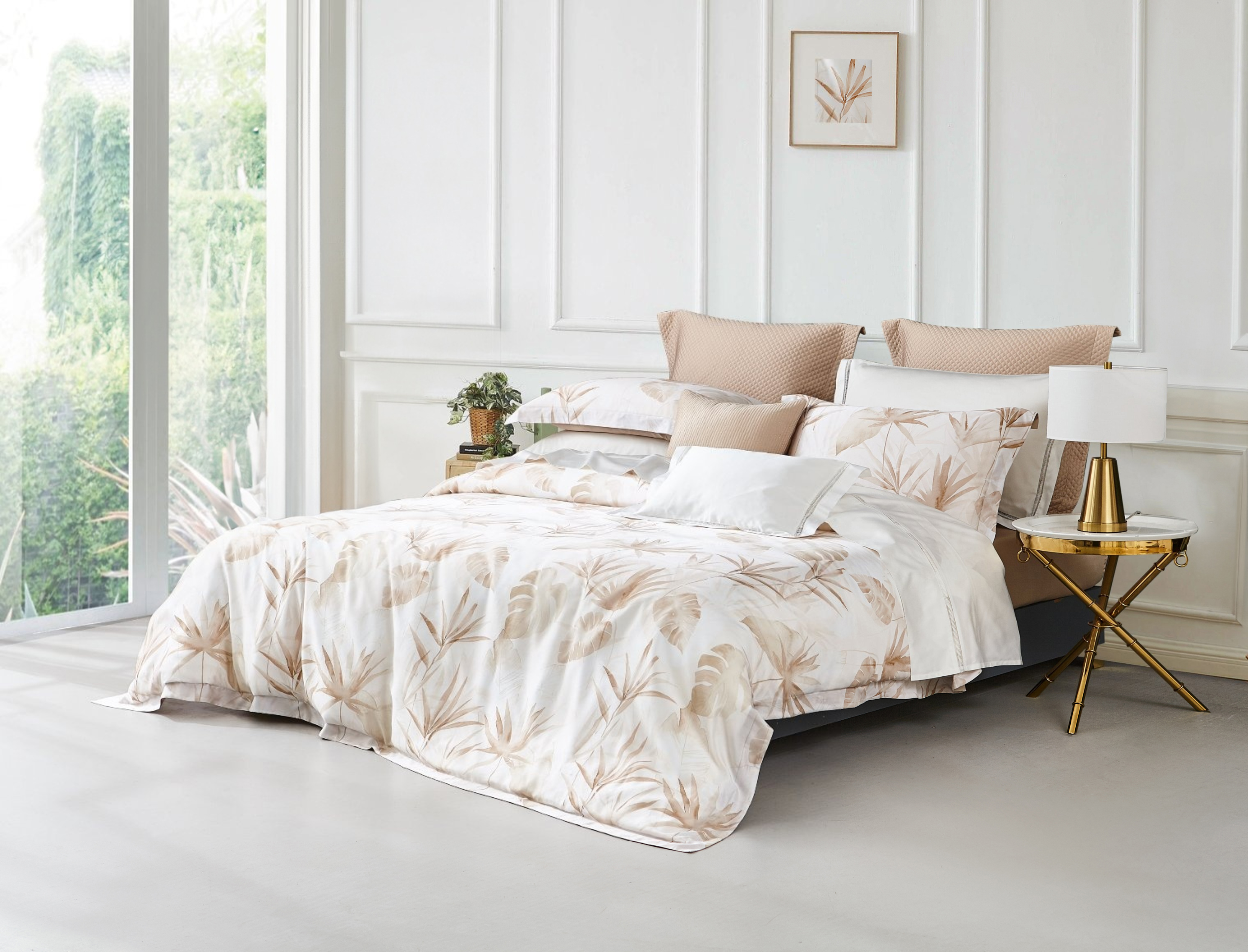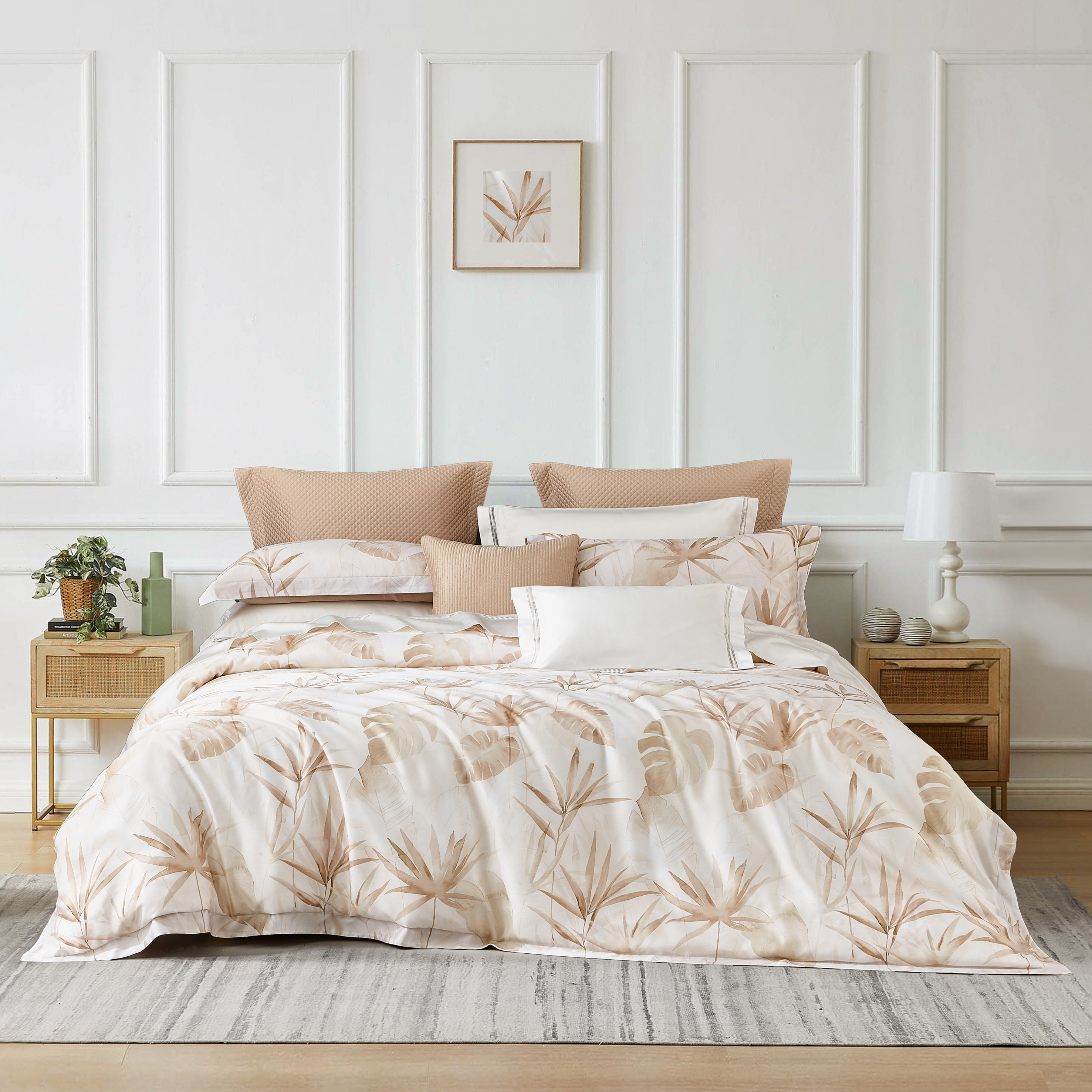 采用60S天丝™棉混纺而成,吸湿透气,清凉爽滑,天然抑菌,大地色优雅大气,简约枝叶设计,打造轻松舒适的睡眠环境。