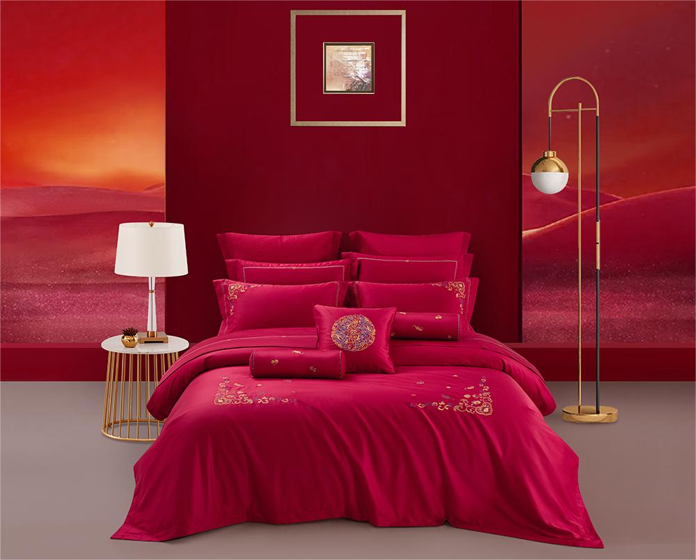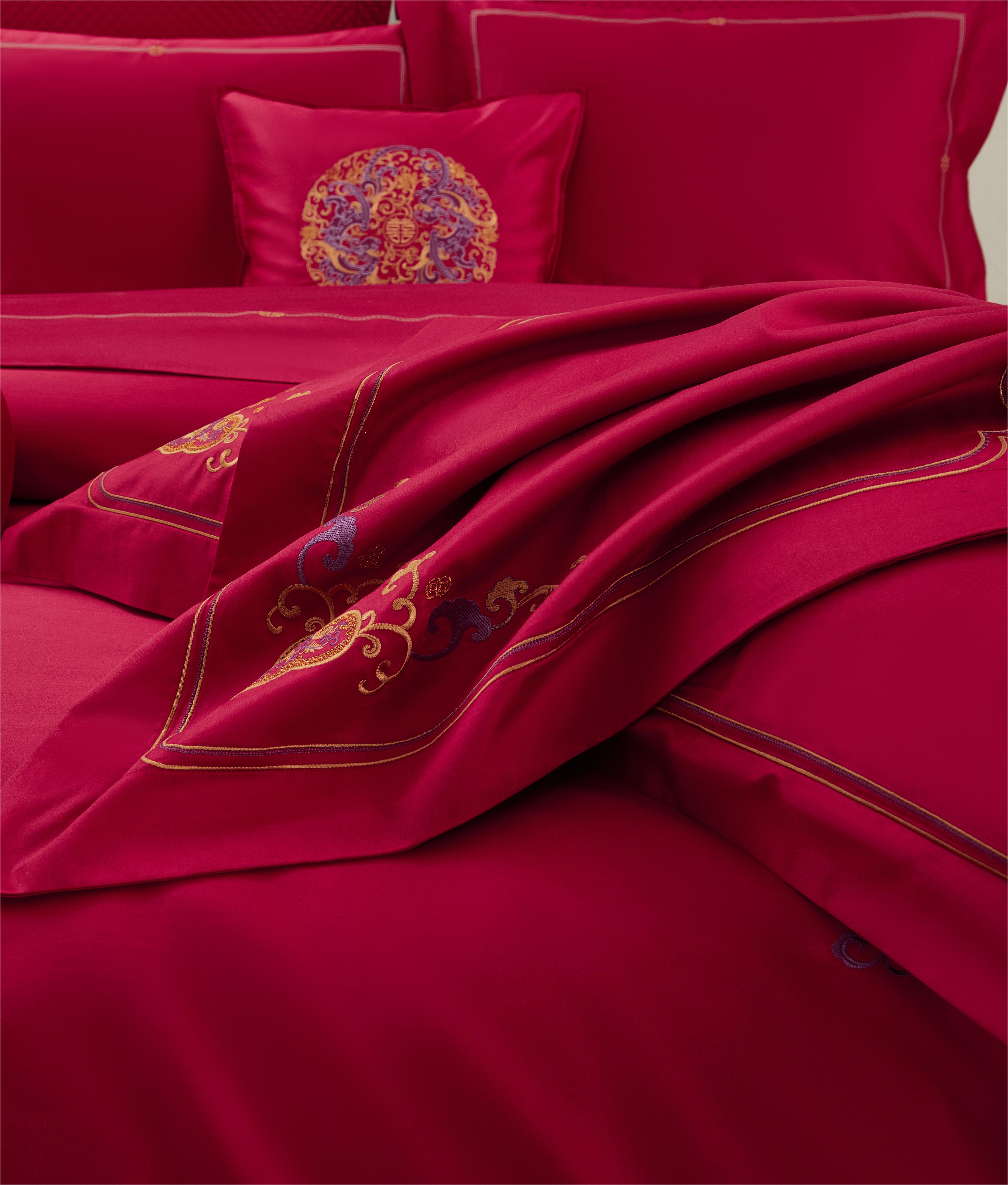 祝福以一针一线绣在床品之上,传递的浪漫的术语与对新人的祝福;奢华的刺绣工艺,显得优美典雅。刺绣的颜色采用的是金色与紫色,金色象征的是财富,中国传统的紫色代表了是尊贵以及紫气东来寓意;两端的图案左右相呼应有携手同行,寓意新人感情稳定。