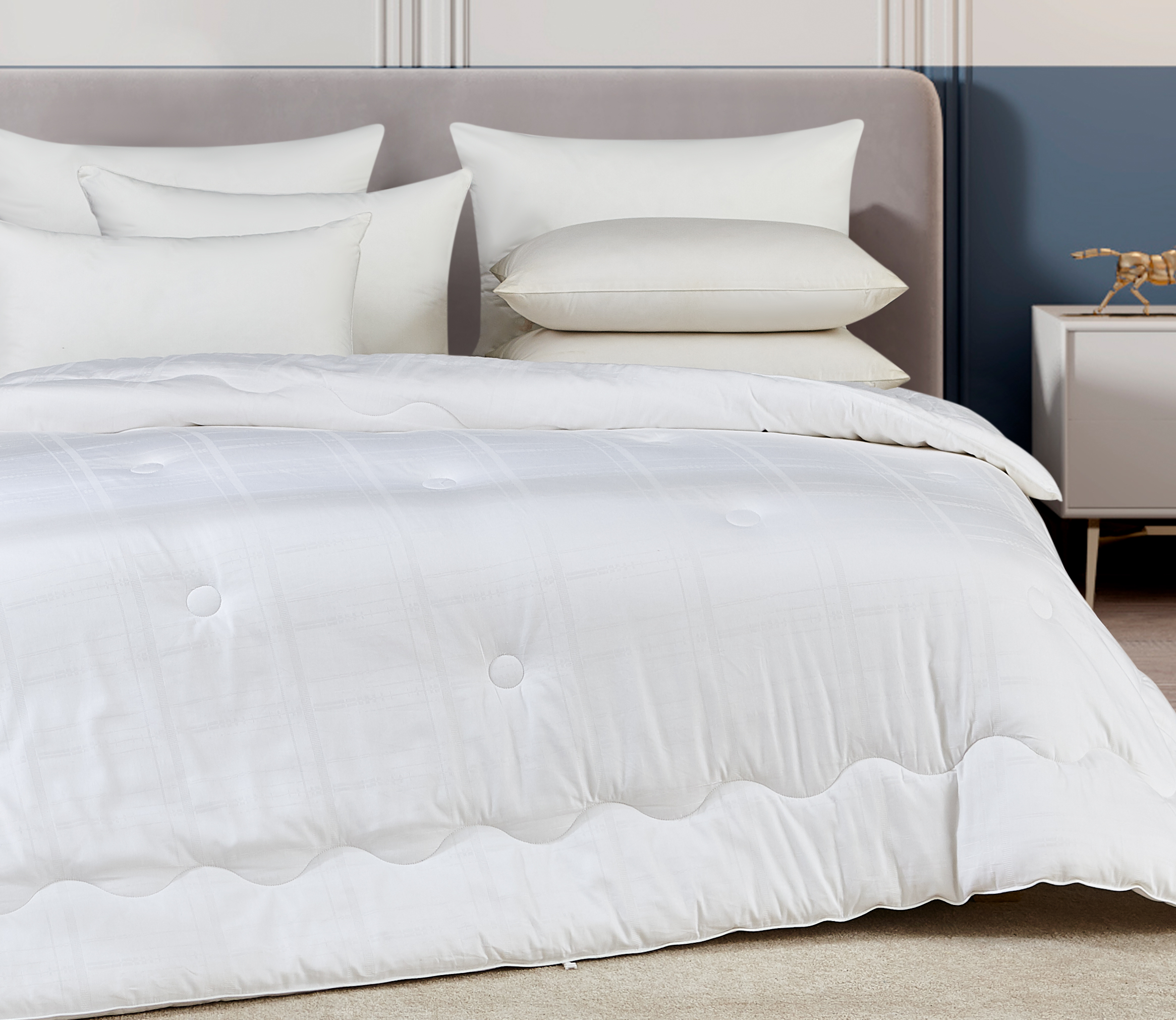 甄选蚕丝+纤维结合填充,亲肤舒适,透气性好,富有弹性和柔韧性,聚酯纤维吸湿透气,不易结块。全棉面料,温暖好棉,柔软舒适,曲线绗缝与点状绗缝相结合,美观大方,固定填充物均匀不易移位。